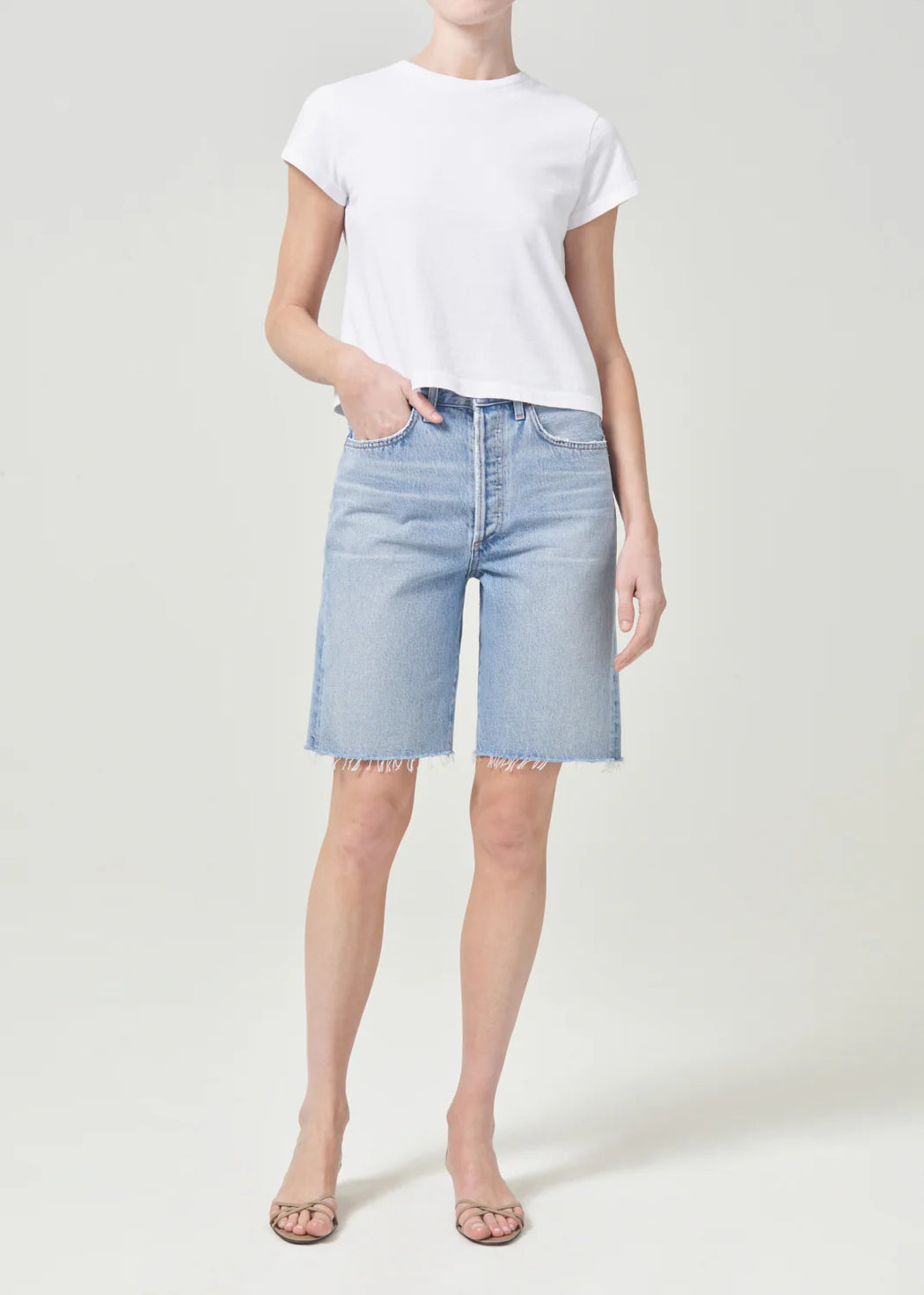 Inspired by our best-selling 90's fit, the 90's short is relaxed on the wiast with a raw hem above the knee.