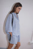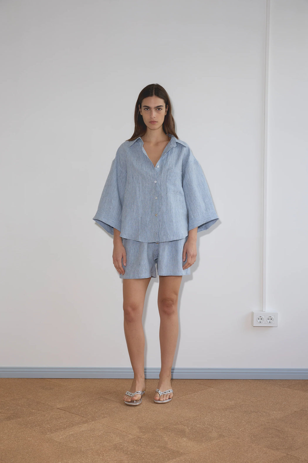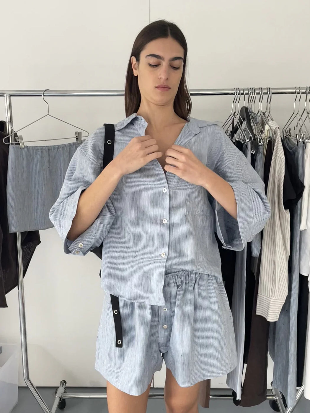 Features an oversized box fit linen shirt with wide arms and a front pocket designed to sit mid rise, the loose fitting boxer style shorts have a faux button down fly and an elastic waist for extra comfort.