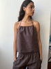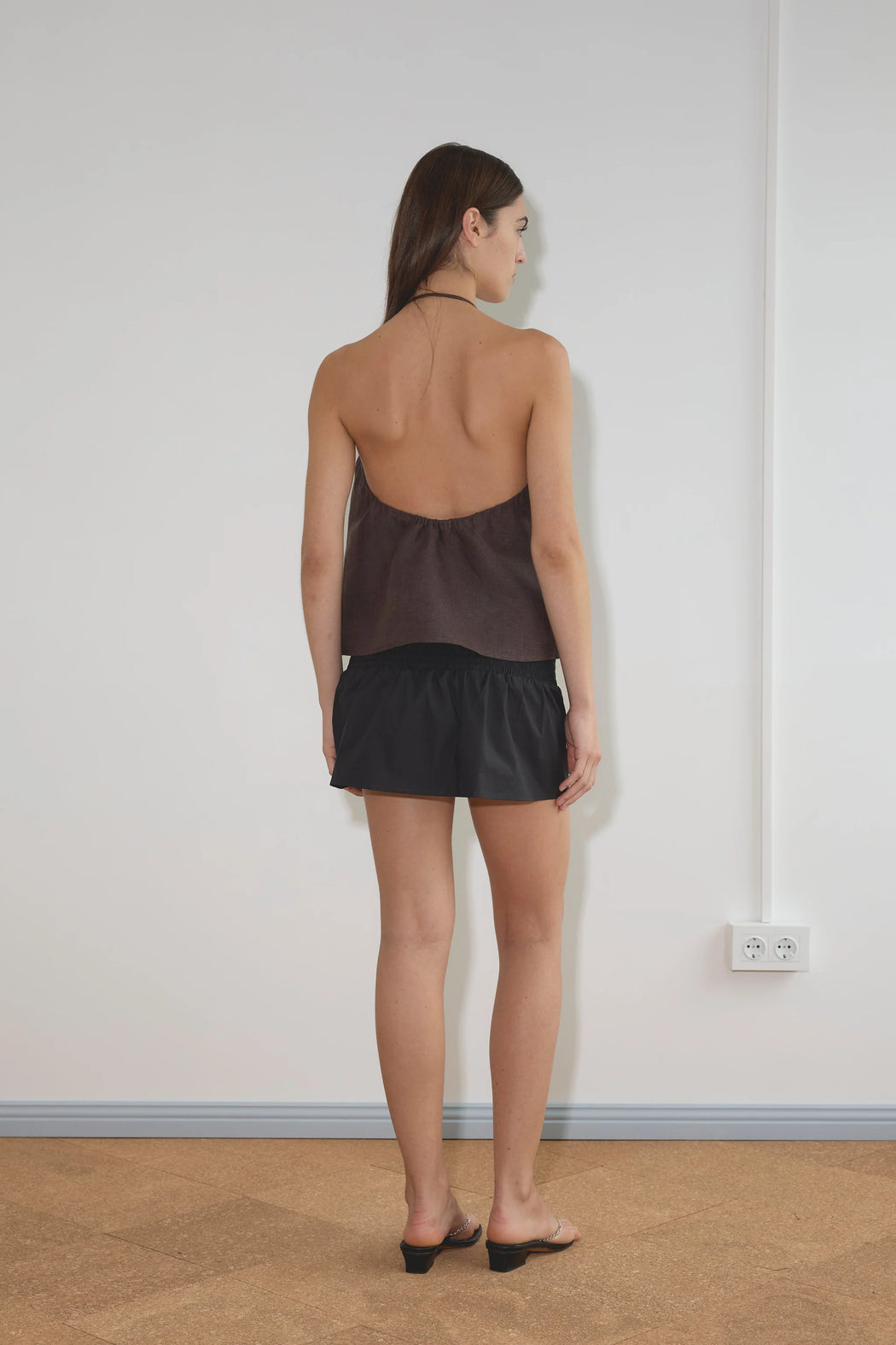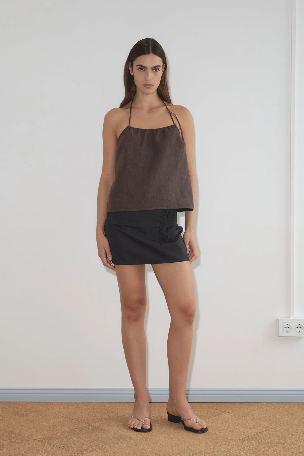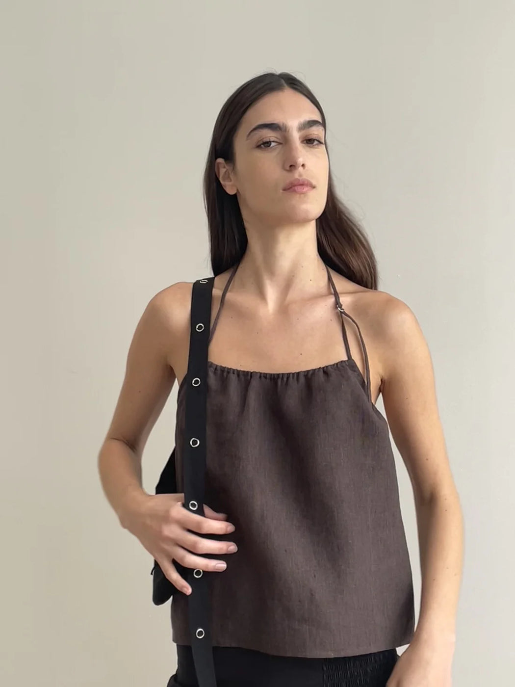 Relaxed halter top features flattering curved neckline with adjustable o ring fine halter straps.