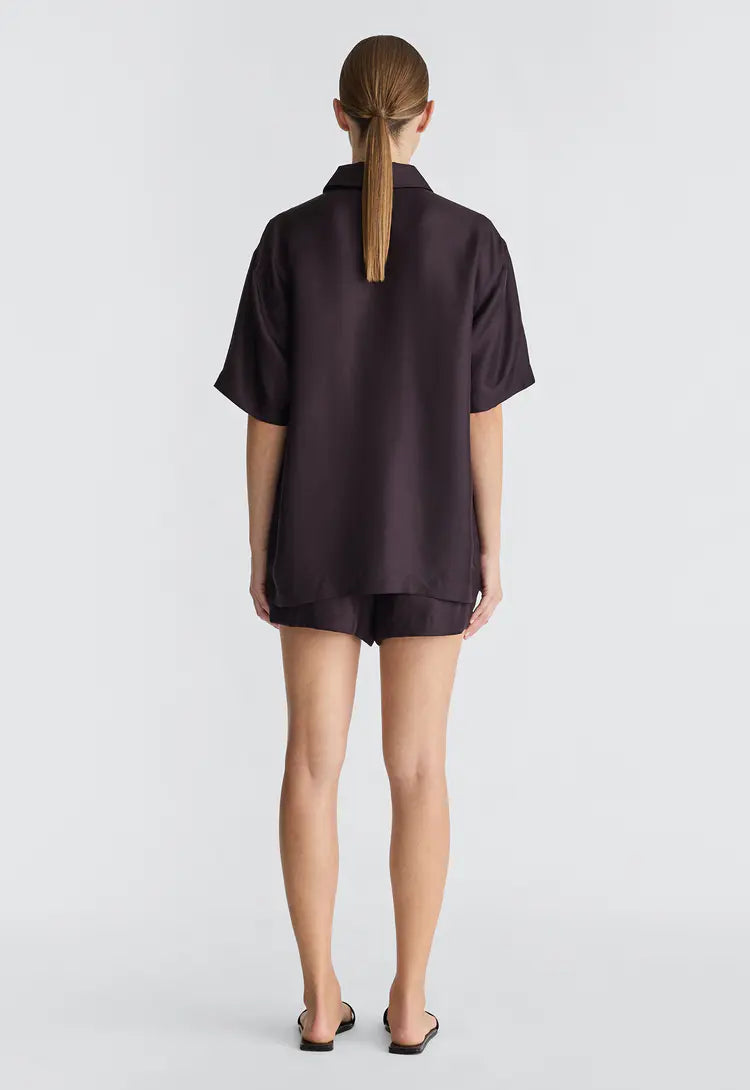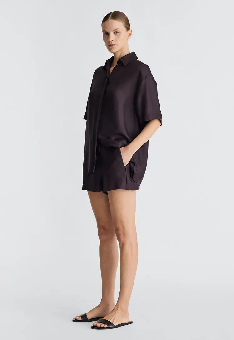 A modern approach to the classic silk shirt, this piece features a classic collar, button down placket, and slightly oversized sleeves. Cut from silk twill with a soft lustre, this women's silk shirt balances the natural drape of a fluid fabrication with a boxy cut. Style back with matching silk shorts for an easy, elegant ensemble.