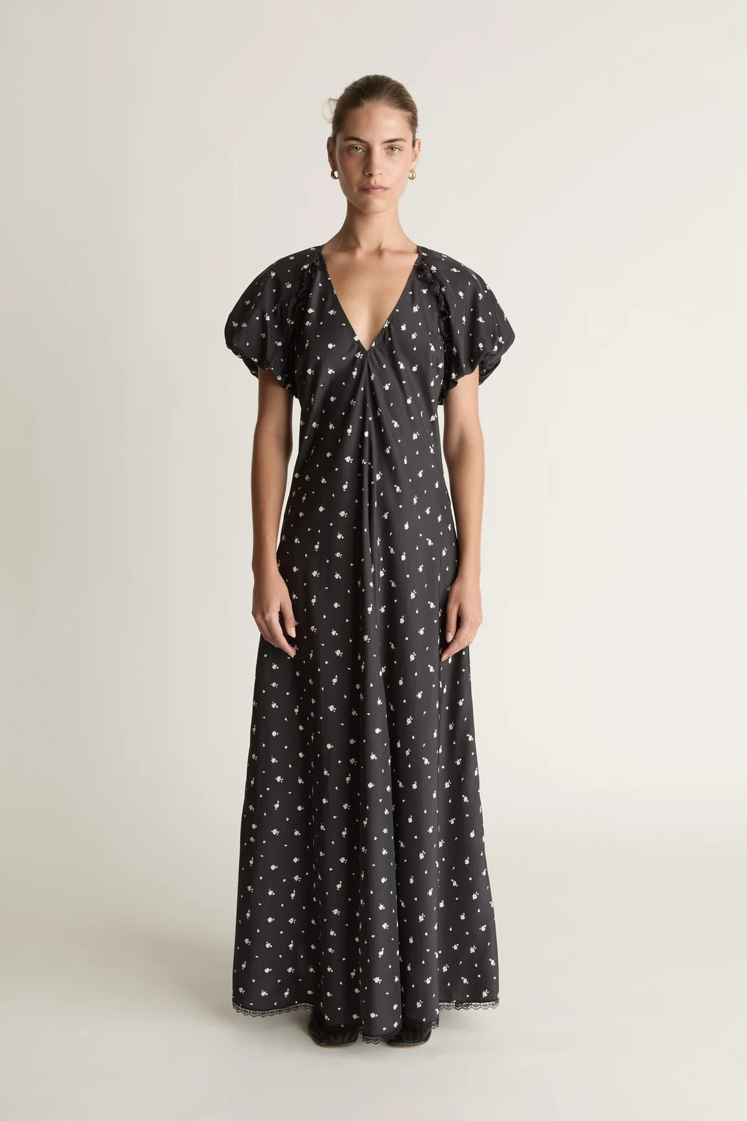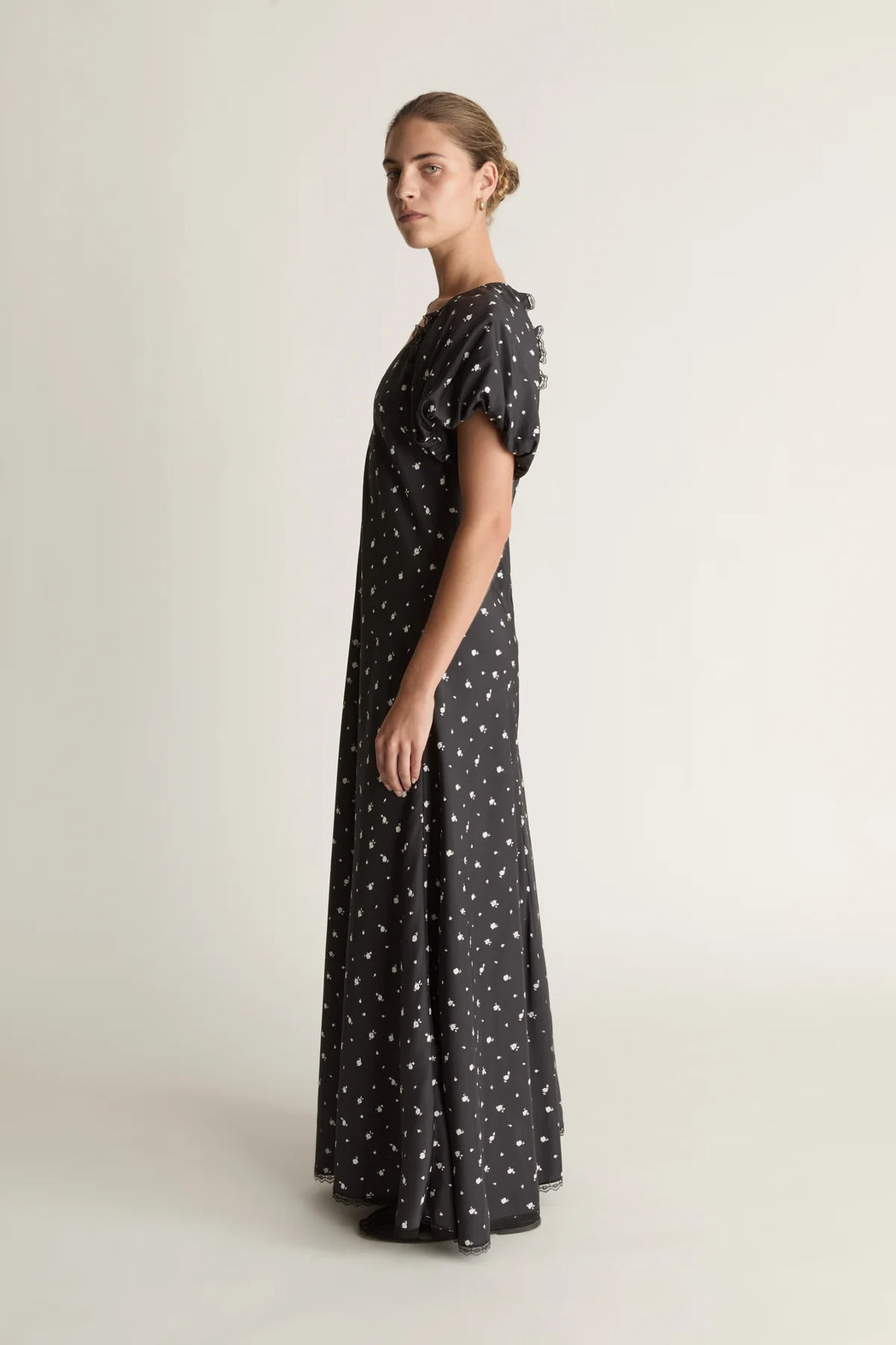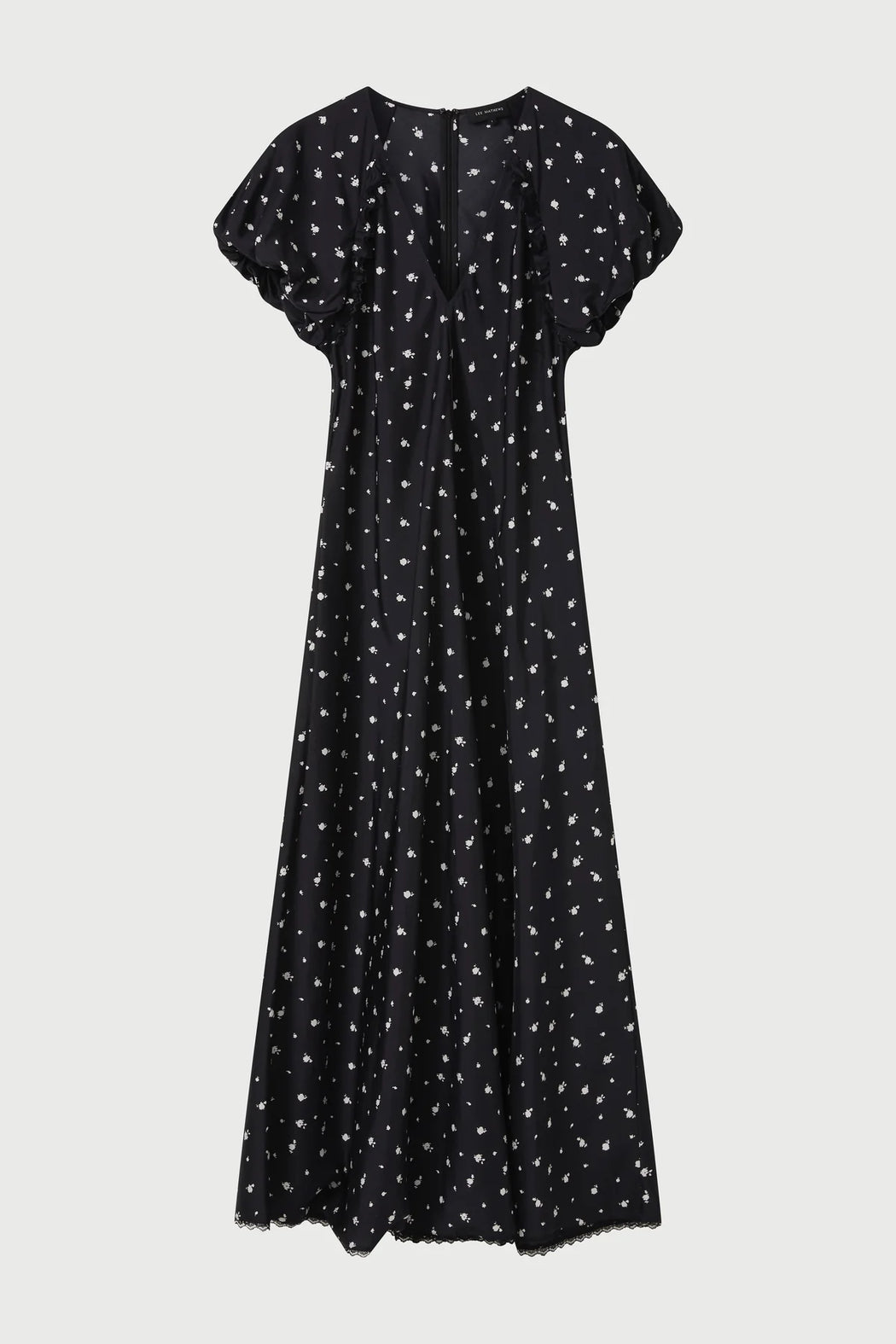 A 100% silk habotai maxi dress in an archive floral print. Features a V-neckline, gathered puff sleeves and detailed with lace trim.
