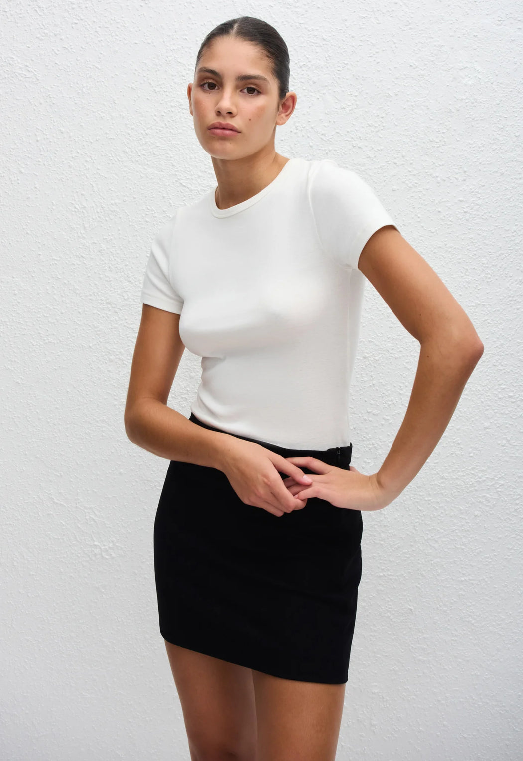 Kiara is 178cm and wears the Crepe Mini Skirt in Black in a size 3. This style is true to size, take your regular size.
